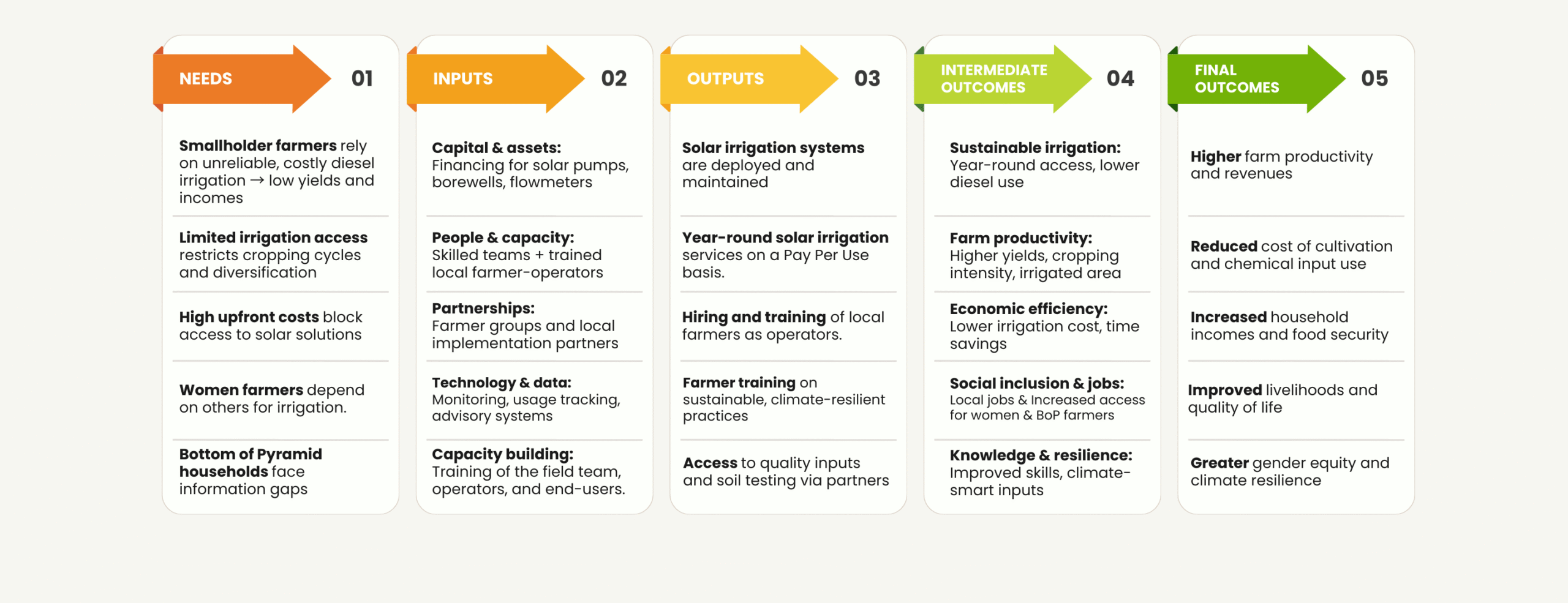 By replacing costly diesel irrigation with affordable solar solutions, agronomic training, and combining technology with on-ground support, Oorja helps farmers move from uncertainty to stability. Over time, this leads to higher productivity, higher incomes, better food security, and more resilient rural livelihoods, especially for women and smallholder farmers.