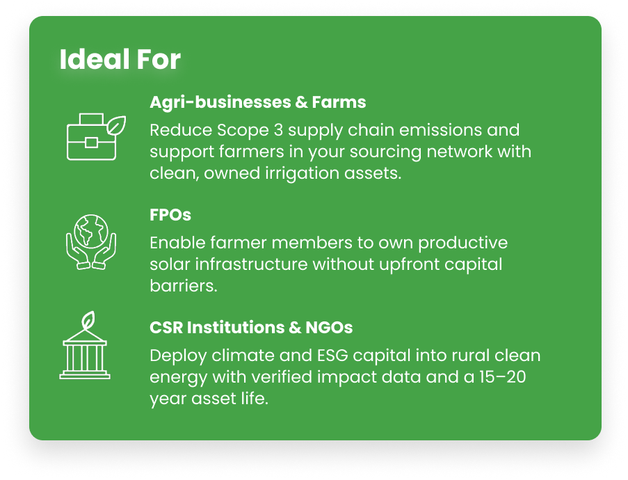 If your institution is evaluating ownership-based solar irrigation aligned with climate, ESG, rural enterprise, or supply chain objectives, we welcome a conversation.